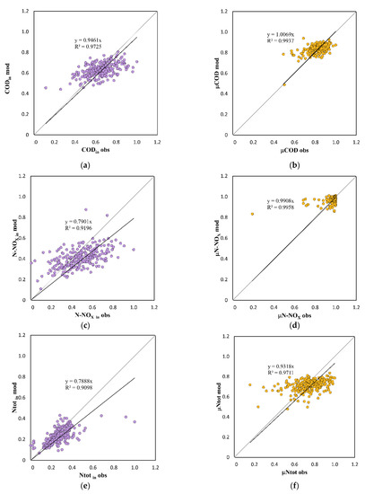 Figure 4 shows the comparisons between the values measured in the plant and the values estimated by the multiple linear regressions. Thanks to these comparisons, it is possible to appreciate the excellent goodness-of-fit of the regression models. In particular, the yield value of removal COD and nitrogen forms, apart from ammonia, is well explained by the linear regression against the other monitored parameters. In regard to the COD entering the plant and the COD efficiency, the relationships between measured and estimated values have an angular coefficient of 1.059 and 1.003 with an R2 of 0.98 and 0.99, respectively.