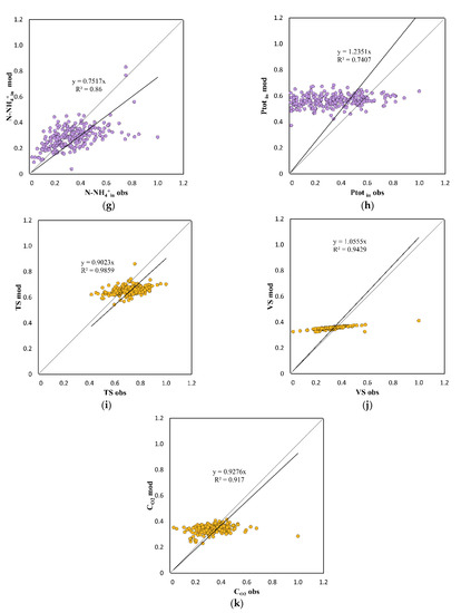 Multivariate linear regressions: comparison between normalized observed value and modelized values Figures from (a–k) show the trend of the measured values and of the modeled values considering both the concentrations of pollutants in input and their removal efficiency.