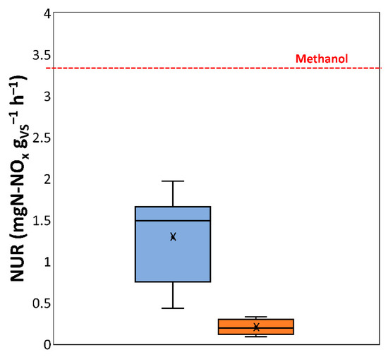 Results of NUR tests and comparison with the literature value [13,32] obtained with methanol dosage as a carbon source.