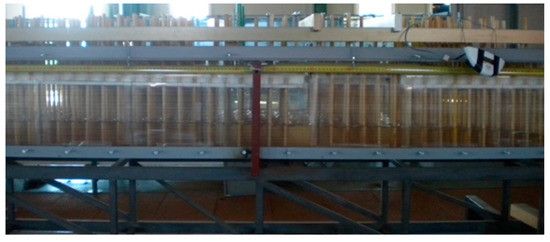 A valve on the input pipe allowed the flow rate regulations, and its measurement was possible by means of a Thomson weir downstream of the flume outlet. The vegetation was modeled by means of two sets of small wooden circular cylindrical rods ( 0.8 and 1.0 ) placed in a central portion of the flume (starting at x = 630 cm from the inlet) of variable length, approximately between 1.5 and 2.2 m. The rods were perpendicular to the bottom of the flume and were secured to two wooden box-structured plates. In a previous study [63], the drag forces acting on a group of stems were measured by maintaining the stem ends at a distance of about 1 mm from the bottom in uniform or quasi-uniform flow conditions.