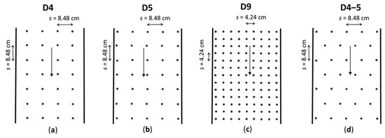In this study, 29 free surface profiles were observed, with four stem densities, achieved arranging the stems on three square meshes at two distances, and 8.48 cm, where and are the spatial distances between the centers of two stems in the streamwise and spanwise directions, respectively, and one staggered mesh (D4–5). The four arrangements are sketched in Figure 2. Three different bed slopes were considered, , , , and the flow rate was varied between 5.27 × 10−3 and 16.39 × 10−3 m3/s.
