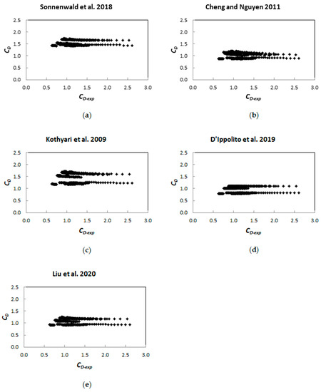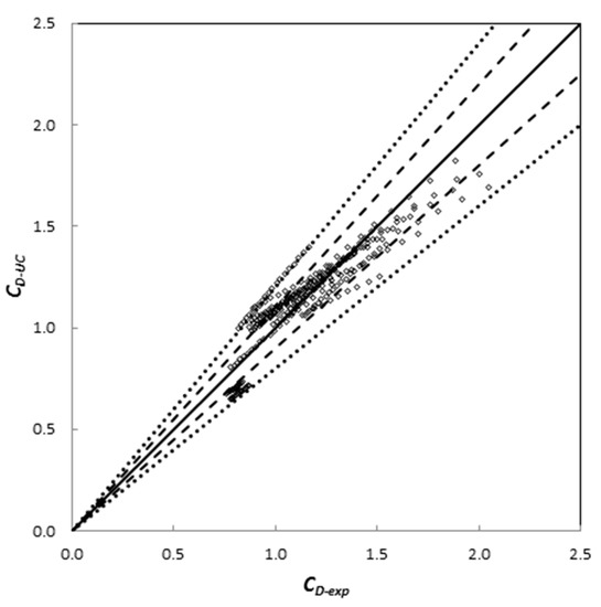 Yerdelen et al. [66] calculated the drag coefficient on the basis of approximately 70 experiments under the assumption of uniform and non-uniform steady flows. These authors stated that adopting the values obtained under the conditions of uniform flow, when the flow is not uniform, leads to significant errors and, moreover, by excluding the smallest densities (), the drag coefficient decreases with an increase in . It should be noted that they referred to the average values collected in the field.