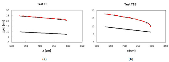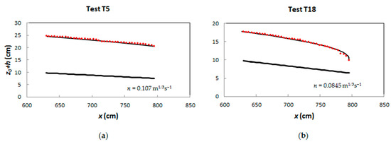 Comparison between the measured and the calculated free surface profiles obtained by means of the best Manning coefficient: (a) T5; (b) T18. The black bold line indicates the flume bottom; the black line is the calculated free surface; the red symbols indicate the measured free surface.