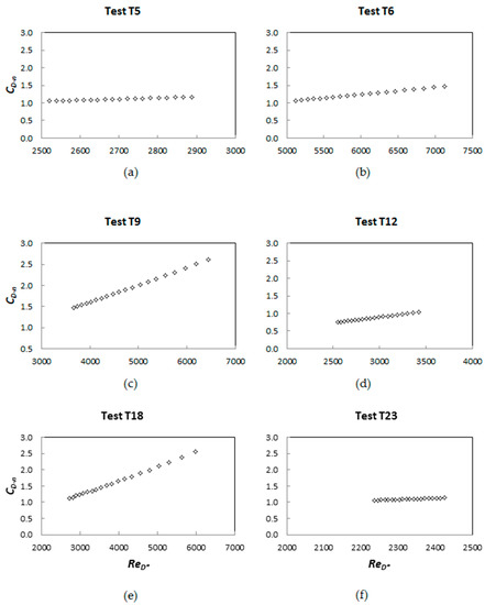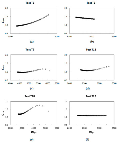 Drag coefficients obtained following the procedure of Wang et al. [1]: (a) T5; (b) T6; (c) T9; (d) T12; (e) T18; (f) T23.