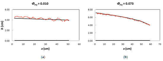 Equation (28) was also used to simulate four of the profiles observed by Wang et al. [1], i.e., the ones with comparable densities (Φveg = 1.0%, 1.8%, 4.1% and 7.3%) to those for which the above equation was derived (Φveg = from 0.97% to 4.36%). The comparisons between the experimental and simulated profiles for two densities are shown in Figure 11. Both profiles are well simulated, whereas the water depth related to densities Φveg = 1.8% and 4.1% is slightly underestimated. It should be pointed out that Equation (1) was derived from the results of experimental tests relating to slopes 0.48% < i < 2.2%. Thus, we can conclude that the method here proposed can give good results.