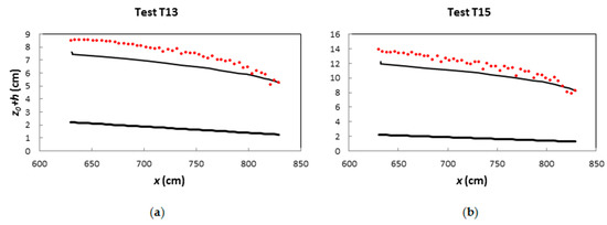 Comparison between the measured and the calculated free surface profiles obtained using in the case of staggered pattern: (a) T13; (b) T15. The black bold line indicates the flume bottom; the black line is the calculated free surface; the red symbols indicate the measured free surface.
