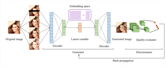Face image de-identification includes obscuring the identifying information in the face image, on the one hand, while having the resulting images have a similar effect to the original image in the service, on the other hand. Many recent research works have focused on achieving the aforementioned ideal equilibrium. Reference [2] suggested a technique of face de-identification that depends on the detection of the face and key points, followed by variational adaptive filtering, to achieve the face de-identification while preserving expression. Reference [3] devised unique verifying and regulating modules in the process of face de-identification to ensure that de-identified photos maintain structure similarity. Reference [4] fine-tuned the encoding section of the typical autoencoder and completed the de-identification operation in the latent space, allowing the original face pictures to retain their nature and variety while creating new faces with various identity labels. These technologies are oriented toward one specific quality standard (such as facial expressions) [5], and there is not yet a model that can automatically adjust the process of generating images according to the needs of different service evaluations. The need to develop an effective face de-identification model for privacy protection cannot be overstated.