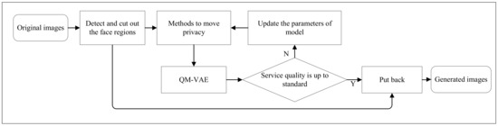 At the beginning of the process, we perform face recognition on the original image before privacy protection, in which the face area is cut out for subsequent processing. Then, we utilize the face de-identification methods mentioned in Section 3.1 to modify the cropped area. In the utility reconstruction stage, de-identified images will be fed into the QM-VAE.