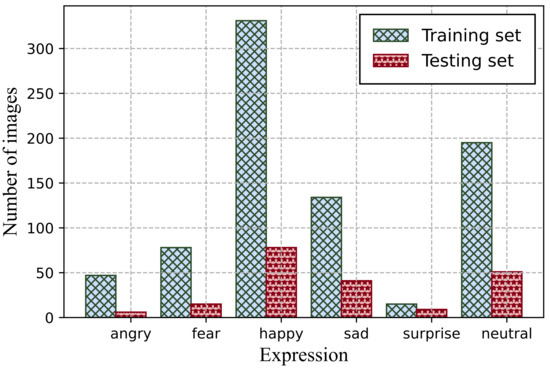 We implemented QM-VAE on the CelebA dataset [63], an open dataset containing sufficient face images after alignment and cropping. We selected the first 1000 images in the dataset for the experiments, of which, the first 80% were used for training and the remaining 20% for testing. To verify the wide applicability of QM-VAE, we divided the datasets into six categories according to expressions, including angry, fear, happy, sad, surprise, and neutral. The expression distribution of the whole dataset is shown in Figure 4.