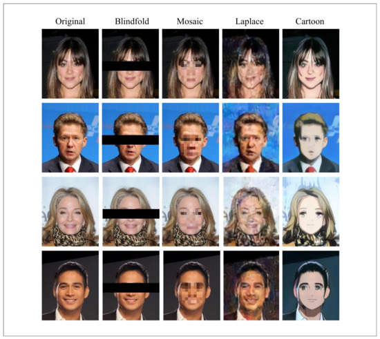 We adopted four de-identification methods to process 1000 face images. According to the chosen method, we can divide the processed images into four data groups: blindfold, mosaic, Laplace, and cartoon. Examples of the original images and processed images are illustrated in Figure 5.