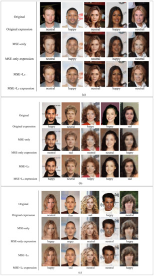 According to the method described above, in each iteration of QM-VAE training, we record the original images’ and the output images’ expressions, respectively. With the same result as the goal, the service quality loss function is determined, as shown in Equation (8). When the result of facial expression recognition of the output is the same as that of the initial image, it is considered that the quality of service is maintained, and is set to 0; otherwise, it is set to 1.