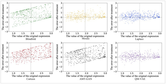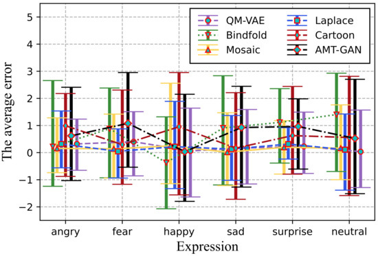 We calculated the difference of the values corresponding to the facial expression recognition results before and after being processed by the four selected methods, AMT-GAN and QM-VAE, and drew error scatter plots and error bar diagrams of data, as shown in Figure 9 and Figure 10. Compared with the other five methods, QM-VAE shows a more stable and excellent utility maintenance ability when the results of facial expression recognition are diverse.