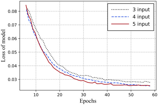 Through the comparative test shown in Figure 8, we can find that the AMT-GAN has excellent visual effect. Therefore, in the service scenario where the image can only be slightly changed, we can add the AMT-GAN as an input of QM-VAE, so that QM-VAE has five inputs. Figure 12 shows the changing trend of model loss when the input number of QM-VAE is 3 (removing blindfold), 4 (used above), and 5 (adding AMT-GAN).