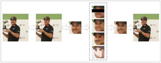 In recent years, face image privacy protection has been extensively researched [7,8,9]. Traditional privacy protection research has focused on some simple methods applicable to standard static images, such as image pixelation, image blurring, color block masking [10], etc. These rudimentary techniques, however, are insufficient for removing all privacy data from the original image [10,11]. Reference [12] took advantage of a multi-task deep learning network to detect the location of privacy-sensitive information and then provided simple protection through image blurring, while the visuals were severely compromised.
