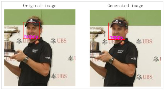 The emergence of Generative Adversarial Networks (GANs) [26] provides a new path for face de-identification research [15,27,28,29,30]. In [31], a GAN was used for the inpainting of facial landmarks in the conditioned heads. This preserves some details of the images to a certain extent while generating face images with high visual quality, which is more effective in face de-identification than pure blurring approaches. Wu et al. [3] proposed the CGAN-based PPGAN to tackle the face de-identification issue by using a single face image as the input and producing a de-identified image with the structural similarity. Although the image processed by the PPGAN may keep the original emotion, its identity obfuscation quality is not particularly strong [1]. In order to improve the effect of de-identification, Li et al. [32] put forward the SF-GAN method, which balances the effects of different elements on face de-identification by constructing various external mechanisms. Reference [4] proposed a variety of face de-identification methods based on fully connected and convolutional autoencoders, learning to moving the sample to other samples with desired attributes and away from those with conflicting attributes through the training of an encoder. Reference [33] combined the Variational Autoencoder (VAE) [34] and CGAN [35] into the Variational Generative Adversarial Network (VGAN) and proposed a Privacy-Preserving Representation-Learning method based on it. This method learns the image representation that is explicitly disentangled from the identity information, effectively preserving the privacy while achieving other tasks such as expression morphing.