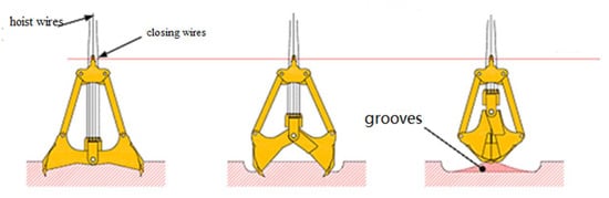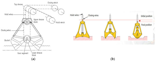 The basic structure of a grab dredger consists of the lower sheave block, the upper sheave block, the bucket body, the gear segment, the hoist wires, the closing wires, etc. Under the gravity action of the grab, the digging force is generated through the action of the closing wires. This is a process of digging dynamic balance [4,5]. As shown in Figure 1a, the grab digging operation is carried out by the following steps: open the bucket, lower the grab down to the material, apply tension to the closing wires, keep the hoist wires static, gradually close the bucket, and start digging with the grab; load the grab dredger to a certain height, while raising the closing wires and hoist wires to achieve full closure of the bucket; then, move the grab to the release site, release the closing wires, keep the hoist wires static, and release the bucket. The operation just described is discontinuous and cyclic [6,7].