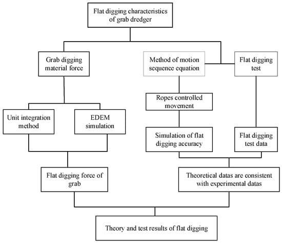 In the process of grab dredger dredging, how to ensure the accuracy of flat digging is a key technical question. The accuracy of flat digging is related to the force of grab digging. However, there are limitations in the traditional method of studying the force of grab digging. In this study, based on the Rankine theory, the unit integration method is proposed to calculate the force process of grab excavation. This method determines the shape and position of the failure surface under the action of active pressure and passive pressure and further obtains a functional expression for the relation between digging force and digging parameters. Through the simulation of flat digging force using the discrete element method (DEM), we obtained results consistent with the calculation results of the unit integration method. In addition, this study sought to control the movement distance of the closing wires and the hoist wires through the equation of motion, to carry out the precision calculations of theoretical data, and experimental research into grab flat digging. By comparing theoretical data and test data, the following conclusion was drawn: the deviation of the theoretical flat digging precision from the test data falls within the allowable range, at 3.15%. This study provides technical support for the flat digging process of the grab dredger.