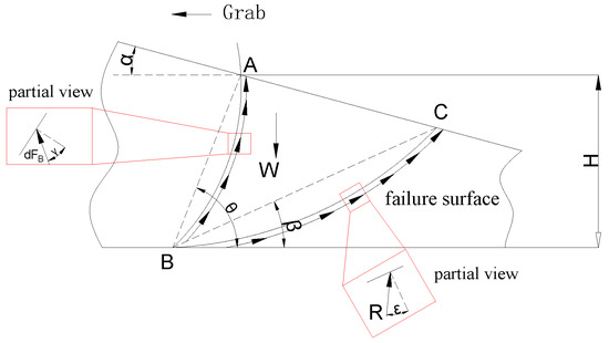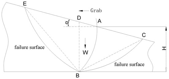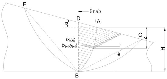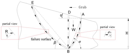 Based on the Rankine theory, this paper proposes the unit integration method to analyze the process of excavating materials. Analysis of the destruction process of the material shows that the front and back directions of the grab form a failure surface. The destruction of the material creates a passive pressure in the front of the grab, and an active pressure in the back of the grab [16,17]. Through the unit integration method, the functional expression of the digging resistance of the grab can be obtained. In Figure 3, the curved surface BC represents the active failure surface, and the curved surfaces BE and BD represent the passive failure surface. In the figure, AB represents the grab bucket, and the digging direction of the grab is from right to left.