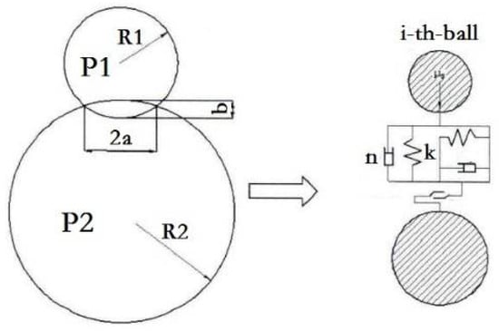In this study, the DEM is used to analyze the contact process of the material particles. Through the output of the particle vibration model, the normal vibration motion equation of the particles can be obtained [22,23]: