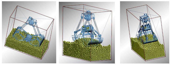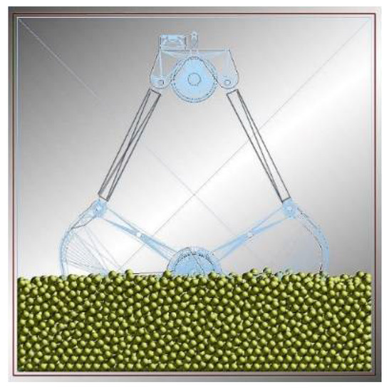 In the mechanical model of the grab, the parameters of the grab are set so that the width of the grab edge is 30 mm. Based on the DEM in the simulation software, we inputted the parameter settings of the grab and material, ran the simulation and obtained the corresponding simulation results. As shown in Figure 15, the simulation is comprised of three stages: initialization, digging and completion.