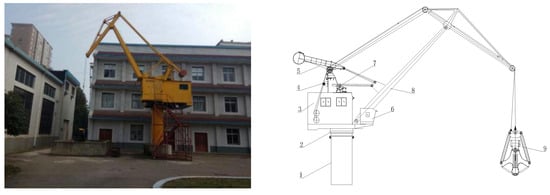 Physical diagram of grab dredger: 1—support cylinder; 2—turntable; 3—machine room; 4—load sensor; 5—balance system; 6—driver’s cab; 7—luffing mechanism; 8—boom system; 9—grab.
