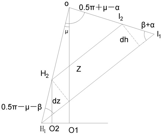 where is the height of the trapezoid of (m), is the angle between the tangent and the vertical direction of the surface point (rad), is the angle between the failure plane and the horizontal plane (rad), is the grab digging depth (m), and is a function of the grab geometry parameters (m).