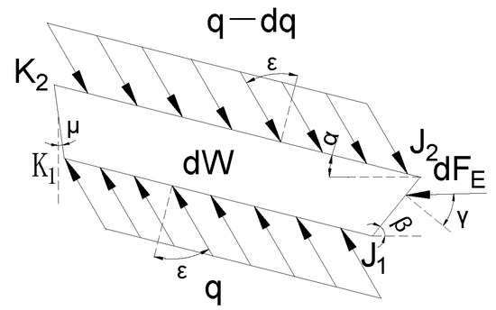 In this study, the unit integration method was proposed to calculate the excavation force of the grab. Regarding the traditional research on the excavation force of the grab, the excavation mechanics model and excavation force equation given by McKyes [27] are shown in Figure 21.