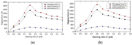 Digging force diagram: (a) Flat digging depth is 75 mm; (b) Flat digging depth is 100 mm.