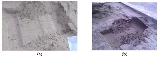 In order to further verify the effect of flat digging precision, the experimental results were studied and discussed. Both the dry and wet sands were dug through to verify the precision of the grab dredger in different sands. Figure 18 shows the topography of the bottom of the trench after flat digging.