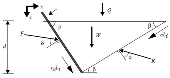 According to the dynamic balance of the material body ABC, the equilibrium state of the material body ABC is calculated using Formula (4). The angle of the active pressure on the horizontal plane can be determined according to Equation (5):