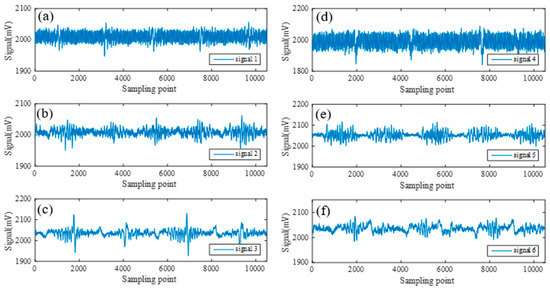 According to the aforementioned experiments conducted, six main original weak signals were acquired and are presented in Figure 2. Explanatorily, signal 1 and signal 2 from Figure 2a,b were obtained from the testing sample of wire rope 1 indicated in Figure 1a with different wire broken numbers of 1 and 3 through inductive transducer, and the sensor liftoff distance was set as 13 mm. Signal 3 and signal 6 shown in Figure 2c,f were acquired through the magnetic sensitive element of copper coils with different liftoff distances of 13 mm and 20 mm for wire rope sample 2. While signal 4 and signal 5 expressed in Figure 2d,e represent the weak original signals obtained from the inner defect of wire rope 3 with the surface liftoff distances of 13 mm and 20 mm by the sensor of inductive transducer. From the perspective of geometric structures, a broken wire defect features sudden loss of the metal cross-section, which leads to the change of wire rope permeability and the magnetized field leak from the body of the tested wire rope, while almost no abnormal magnetic flux leaks from the wire rope except for the strand signal. Therefore, the defect signals are usually characterized with an obvious peak or valley, while the non-damaged wire rope is detected with strand and random noise signals, as marked in Figure 2a.
