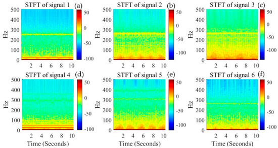 where, t is the time, j is the imaginary unit, τ is the moving center time of the window function, ω is the angular frequency, x(t) is the system input of wire rope testing signals, g(t) represents the hamming window function, and X(ω, τ) are the STFT results in Equation (1). Specifically, the corresponding STFT spectrum of signal 1 to signal 6 shown in Figure 2 are presented in Figure 3, which indicates that these weak signals of wire rope are nearly under the frequency of 250 Hz, and most of the signal components are mixed distributed under the frequency of 50 Hz, while it is difficult to differentiate the specific frequency component of defect signal and the interference components, especially for the signals shown in Figure 3a–c,e,f. Comparing these STFT spectrum and the typical time domain signals, it can be found that the common signal filtering technique are incapable of processing these mixed and weak signals.