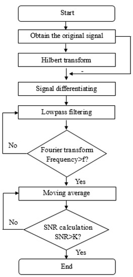 The flow diagram of the proposed method is schematically shown in Figure 4, staring with the data acquisition and pre-amplification for the wire rope testing signals, and the standard Hilbert transform algorithm is applied to obtain a phase changed signal. Then, the signals combining with the original signal are calculated by the differentiating technique. On account of the mixed frequency features of the processed signal, further signal denoising method based on the Fourier transform and lowpass filtering method is applied, aiming at the low frequency and weak defect signal. The lowpass cutoff frequency is mainly determined by the Fast Fourier Transform (FFT) analysis results. Additionally, to obtain a higher SNR of the detection signals, the moving average technique is applied. Generally, many factors would affect the improving of the weak detection signals, such as the averaging method, the moving span, as well as the lowpass cut off frequency. Obviously, different from the traditional single signal denoising method, the proposed weak signal processing methods for steel wire rope is a combination technique which integrates the phase transformation techniques of Hilbert transform and signal filtering methods. Consequently, the weak signals and defect are well distinguished.