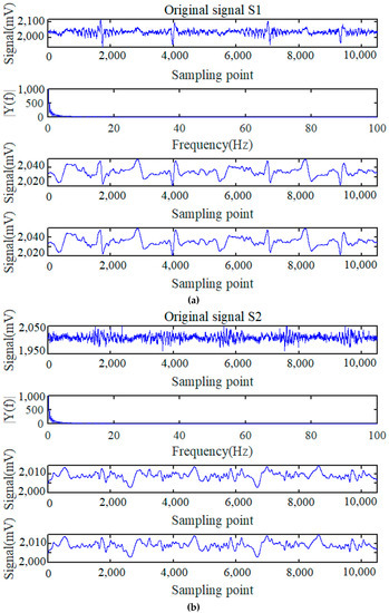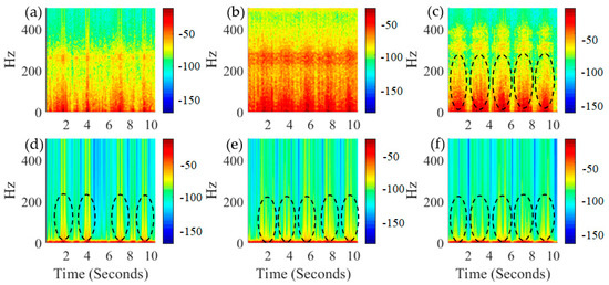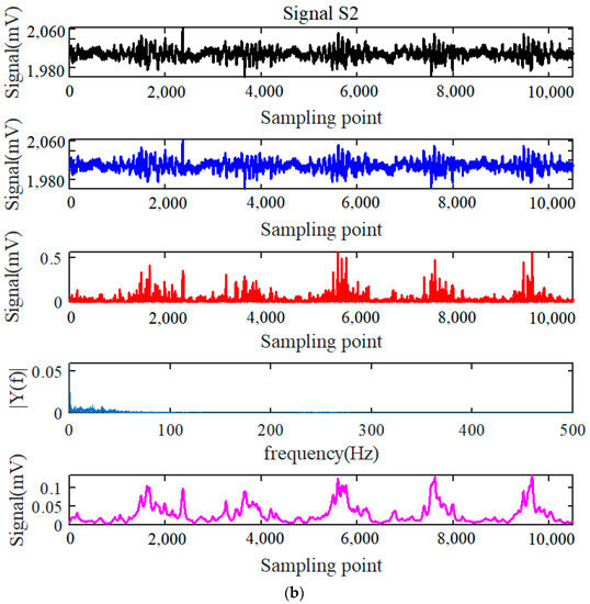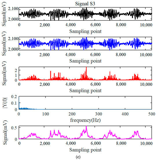 Finally, the time-frequency joint analysis by short-time Fourier transform is presented in Figure 11. Specifically, the original signals of S1, S2, and S3 after the processing of HHT and differentiating are shown in Figure 11a–c, while the signals after the final step of smooth filtering are presented in Figure 11d–f, respectively.