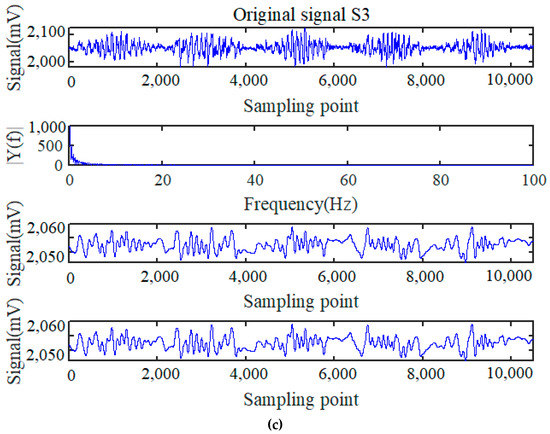 Different weak signals processed by HHT and lowpass filtering method. (a) HHT and lowpass filtering method for wire rope signal S1; (b) HHT and lowpass filtering method for wire rope signal S2; (c) HHT and lowpass filtering method for wire rope signal S3.