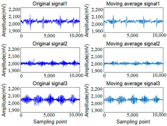 Explanatorily, all the original defect signals in the left side are very weak, and the defect features become more and more difficult to recognize from signal 1 to signal 3. Although the processed signals shown in the right side manifest that the burr noise features are abridged and the SNR is improved in some extent, especially for the median filtering signal 1, the weaker signals of 2 and 3 are still difficult to identify judged by the median filtering signal of 2 and 3. Namely, the nonlinear signal processing method of median filter could denoise the wire rope signals to some extent, the defect features of weak wire rope signals are still overwhelmed by multi-source noises. Therefore, the single median filtering method is also incapable of weak wire rope signal denoising as well as the feature identification. Nevertheless, a linear signal processing method based on the moving average technique is presented. When the moving average span is set as 200, the typical three kinds of original signals and the processing results by moving average technique are shown in Figure 7. Similarly, the SNR of these weak signals are improved to some extent, but the defect features still could not be effectively identified, especially for the big liftoff wire rope inspection signals expressed in moving average signal 2 and 3.