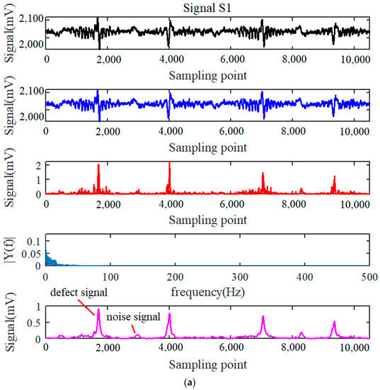 where ψ is a wavelet function and τ is the shifting parameter of the window function in Equation (7). As illustrated in Figure 5, three kinds of typical weak signals were randomly chosen from the experiments. Explanatorily, the S1 signal shown in Figure 5a means that the original signals were obtained from steel wire rope sample 1 with three-wire broken defect under the detection condition of the big liftoff distance of 20 mm by the coil sensor. Similarly, the signals of S2 and S3 expressed in Figure 5b,c represent that the signals were acquired from the one-wire broken defect of wire rope sensed by the inductive transducer under the liftoff distance of 20 mm and 13 mm, respectively. Specifically, S1 to S3 are the expanded part for signals 2, 3, and 5 as mentioned before. The original signals in the first line box of Figure 5a suggest that the weak wire rope inspection signals are mixed with strand signal features, while the FFT spectrum in the second line box implies that the original testing signals are distributed within the low frequency region smaller than 10 Hz, which also validates the time and frequency analysis results mentioned in Figure 3. Consequently, when the lowpass cutoff frequency was set as 5 Hz, the processed signals were shown in the third line box. Obviously, some interference signals were highlighted and became more prominent, while the defect signals were also filtered and abridged. After the further wavelet denoising by the wavelet of db6 (Daubechies 6 function) under the decomposition level of 16, the final processed signals were presented in the last line box. Obviously, the interferences of the noise signals are still prominent and difficult to distinguish from the real defect signals; in other words, the lowpass filtering and wavelet combined denoising methods are incapable of processing the weak wire rope signals to some extent.