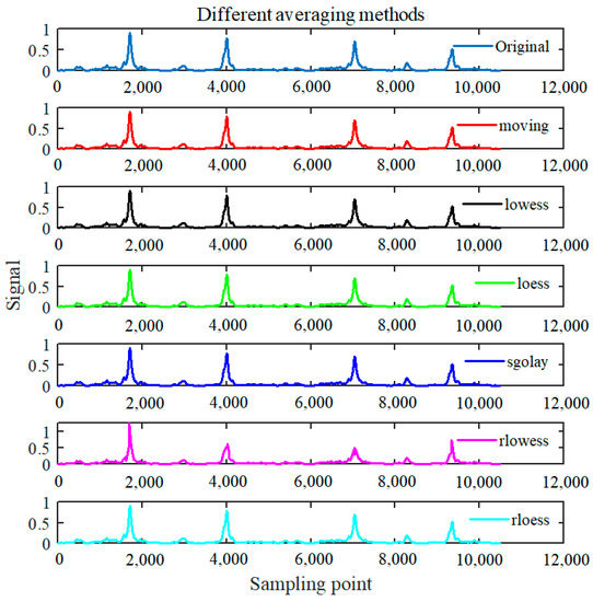Accordingly, six types of smooth filtering functions and methods were used and compared regarding to the processed signal of S1, as shown in Figure 9. Explanatorily, the legend of original and moving represent the lowpass filtering signal of S1 which is to be further processed with its smooth filtering processed signals by moving average method. The legend of lowess and loess in the third and fourth line box means that the signals were processed by weighted linear least squares with first-order polynomial model and second-order polynomial model, respectively, while the sgolay means the smoothing signals processed by the Savitzky–Golay filtering method. Similarly, the rlowess and rloess represent the signals processed by robust lowess and loess methods, separately. Obviously, the signals processed by the moving average method become smoother in the amplitude and shape, and the micro fluctuation of the interference signals become smaller, as well as the signals processed by local regression techniques of lowess and loess. However, the signals processed by rlowess methods shown in the penultimate line box indicate that the signal amplitudes become weaker compared with these signal processing results mentioned above. The signals processed by rloess method expressed in the last line box were also featured with high SNR and distinct signal peaks. According to these signal processing results filtered by smoothing techniques, it could be found that almost all the smoothing and averaging methods were available for the original lowpass filtered signals except the rlowess method. Consequently, the typical moving average method was chosen as the smooth filtering technique in the proposed algorithm.