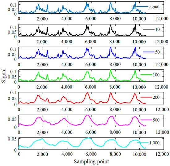 As mentioned above, when the moving average method was applied, the parameter of signal span should also be investigated. The influences of different moving average spans on the smooth filtering signals are presented in Figure 10. When the moving spans were set as 10, 50, 100, 200, 500, 1000, the averaging results for the lowpass filtered signal of S2 illustrated in Figure 8b manifested that as the moving average parameter of span increases, the processing signals became smoother, and the micro interferences also became weaker and smaller. Nevertheless, when the signal averaging span was less than 100, the smoothing results shown in the second to the fourth line box indicated that the processed signals were nearly the same with the original signal, namely, little changes could be observed for these signals both in waveform shape and amplitude. When the averaging span was bigger than 500, some of the signal defect characterizations were also eliminated and reduced, especially for the signal amplitudes, and only little signal fluctuations were observed.