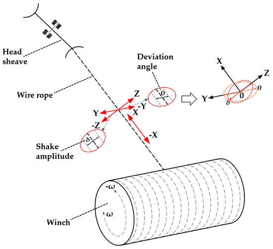The WHM is a traditional hoisting equipment, with one end of the wire rope wound around a winch, and the other end around a guide wheel to adjust the direction of the connection to the transport cage. In the case of wire rope work, as shown in Figure 1, the wire rope is released or retrieved by rotating the winch forward and backward to produce relative movement along the wire rope axis. As the wire rope rotates around the winch, the rope body shakes from side to side and deviates from the central axis, producing the deviation angle θ. Moreover, with changes in tension and speed, the rope sways frequently from the groove of the drum, creating a specific amplitude of δ. Accordingly, along the wire rope axis direction, to establish a spatial coordinate system, the wire rope motion state can be divided into linear motion along the X axis, horizontal wobble along the Y axis, and vertical vibration along the Z axis.