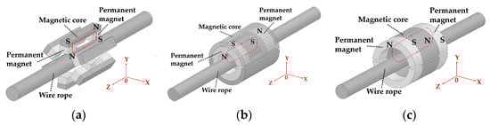 In the nondestructive testing of steel wire rope, permanent magnetic leakage detection devices have been widely adopted [14,15]. The three main types of permanent magnetization sensors for steel wire rope are depicted in Figure 2: (a) a sensor of the magnetic bridge type consisting of multiple independent sets of magnetizers [17,26]; (b) a sensor with radial magnetization consisting of two semi-annular sets of upper and lower magnetizers [19,27]; and (c) an open-loop sensor with axial magnetization consisting of upper and lower half-loop magnetizers [25,28].