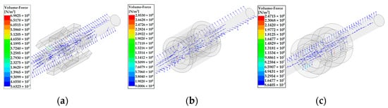 Figure 3 illustrates three types of sensors on the wire rope force situation. The magnetic force applied to the wire rope by multiple magnetic bridge sensors is densely distributed and has a large value, while the magnetic force applied by the open-loop sensor with axial magnetization is sparsely distributed and has a very small value. In Table 2, the magnetic force components and the total force generated by the different sensors are shown. The total magnetic force generated by the three magnetizers, (a), (b), and (c), is 29.406 N, 73.263 N and 15.439 N; in other words, the open-loop sensor with axial magnetization applies the smallest magnetic force to the wire rope, which permits high-speed operation of the wire rope by reducing friction between it and the sensor. At the same time, the sensor with a larger inner diameter is located far from the surface of the wire rope, thus enhancing its service life.