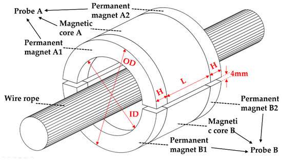 Magnetic pole surfaces of the detection sensors interact with the corresponding wire rope surfaces, resulting in frictional wear to both the measuring probe and high-speed running wire ropes, making it difficult to distinguish between the probe and the wire rope. In order to analyze the magnetic force applied to the wire rope shown in Figure 2, finite element models were constructed of three detection sensors with the same axial length, diameter, and spacing between magnets. The dimensions and properties of the three sensors are summarized in Table 1.