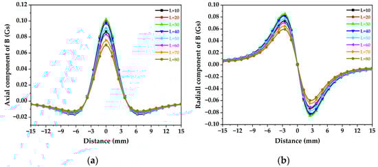 Changes in magnetic flux density with the changed axial length (L) of the yoke: (a) axial component of magnetic flux density; and (b) radial component of the magnetic flux density.