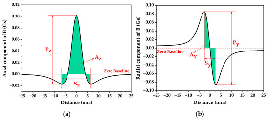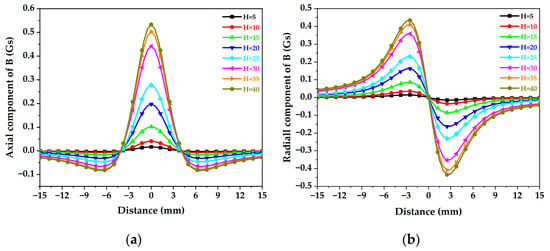 Changes in magnetic flux density with the changed axial height (H) of the magnet: (a) axial component of magnetic flux density; and (b) radial component of the magnetic flux density.