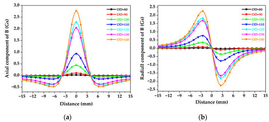 Changes in magnetic flux density with the changed outer diameter (OD) of the magnet: (a) axial component of magnetic flux density; and (b) radial component of the magnetic flux density.