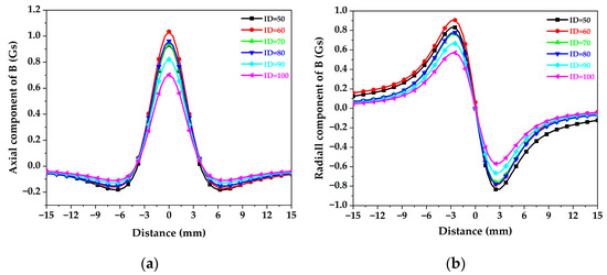 Changes in magnetic flux density with the changed inner diameter (ID) of the magnet: (a) axial component of magnetic flux density; and (b) radial component of the magnetic flux density.