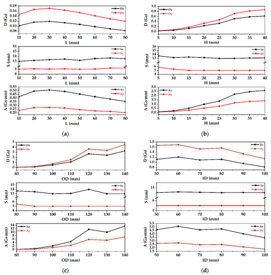 Figure 12a–d shows, in order, the variation law of signal characteristics (D, S and A) when the variables are H, L, OD and ID. As shown in Figure 12a, Dz, Dy, Az, and Ay first increase and then decrease with increasing L, and the defect signal characteristics are maximal when L is 30 mm, whereas Sz and Sy are almost unchanged. Figure 12b shows that Dz, Dy, Az, and Ay gradually increase with an increase in H, while Sz and Sy remain essentially constant. In Figure 12c, Dz, Dy, Az, and Ay generally increase with increasing OD, while Sz and Sy are essentially constant. In Figure 12d, Dz, Dy, Az and Ay first increase and then gradually decrease with the increase in ID, while Sz and Sy are basically unchanged. This means that the change in the dimensions of the magnetizers (permanent magnets and cores) will not have an effect on S (Sy and Sz), but primarily on D (Dz and Dy) and A (Az and Ay) for the same defect. For better detection of the leakage field of defects, the length L of the magnetic core should not be too large, while the values of the thickness H and OD of the magnet should be larger, and the ID of the magnet should be smaller.