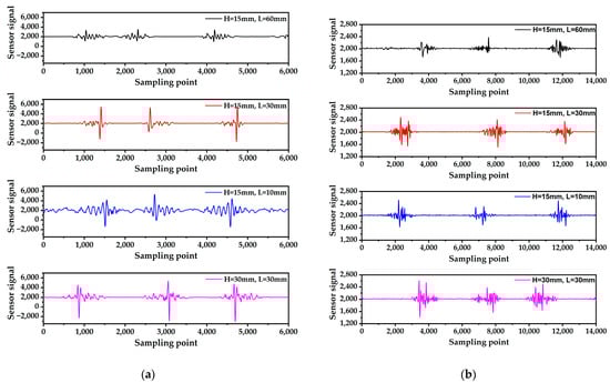 Defect signal characteristics under different variables: (a) defect signal characteristics under the variable L; (b) defect signal characteristics under the variable H; (c) defect signal characteristics under the variable OD; (d) defect signal characteristics under the variable ID.