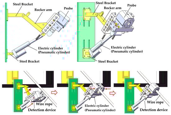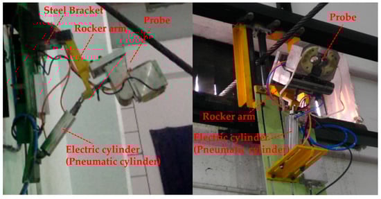 On site, an on-line testing device is needed to send the open-loop permanent magnetization probe to the WMH wire rope so that the axis of the probe is aligned with the axis of the wire rope and it can float to track the movement of the wire rope in different directions. It is therefore designed to work in conjunction with the telescopic cylinder (electric cylinder) to bring the probe into the appropriate position; the working principle of this device is shown in Figure 16. The detection device is mainly composed of an inspection probe for opening and closing with clutch, a lifting cylinder (electric cylinder) and a rocker arm. At first, the lifting cylinder (electric cylinder) and the rocker arm will raise the probe to a specific position such that the probe axis coincides with the wire rope axis. The testing probe is controlled by a cylinder (electric cylinder) that slides the two parts of the probe along parallel linear guide rods to close or open them so that the probe is looped or disengaged from the wire rope.